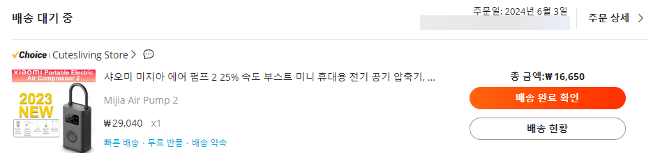 샤오미 미지아 에어펌프를 구매했습니다. 국내 오픈마켓에서 사려고 하다가 알리익스프레스에서 구매했습니다. 알리익스프레스는 직구로 저렴하게 구매할 수 있는데, 코인 상점을 이용하는 방법으로 엄청나게 저렴하게 구매했습니다. 동네 당근에서 3만원 정도에 올라와 있는데, 저는 16,000원으로 구매했습니다. 아래는 인증샷입니다.
