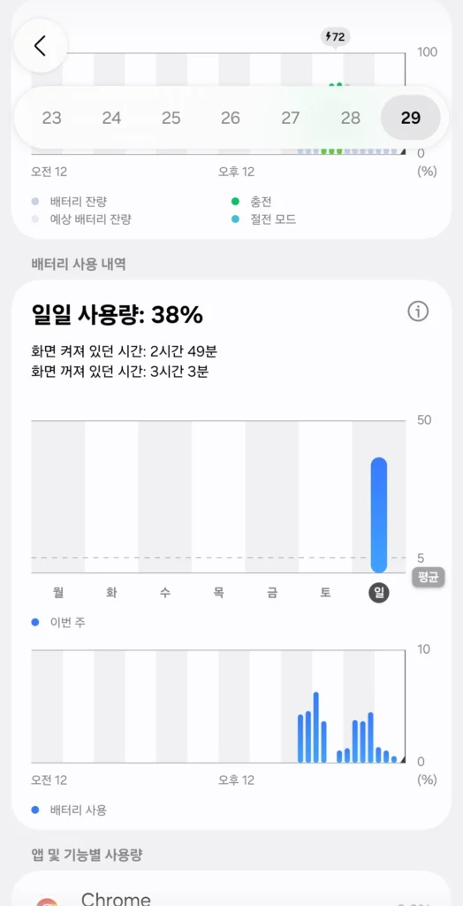 앱 다이어트를 마친 후, 직접 유튜브, 웹서핑, 그리고 AI 앱(ChatGPT, Grok 등)을 돌려보며 실사용 배터리 소모량을 다시 측정해 보았습니다.
