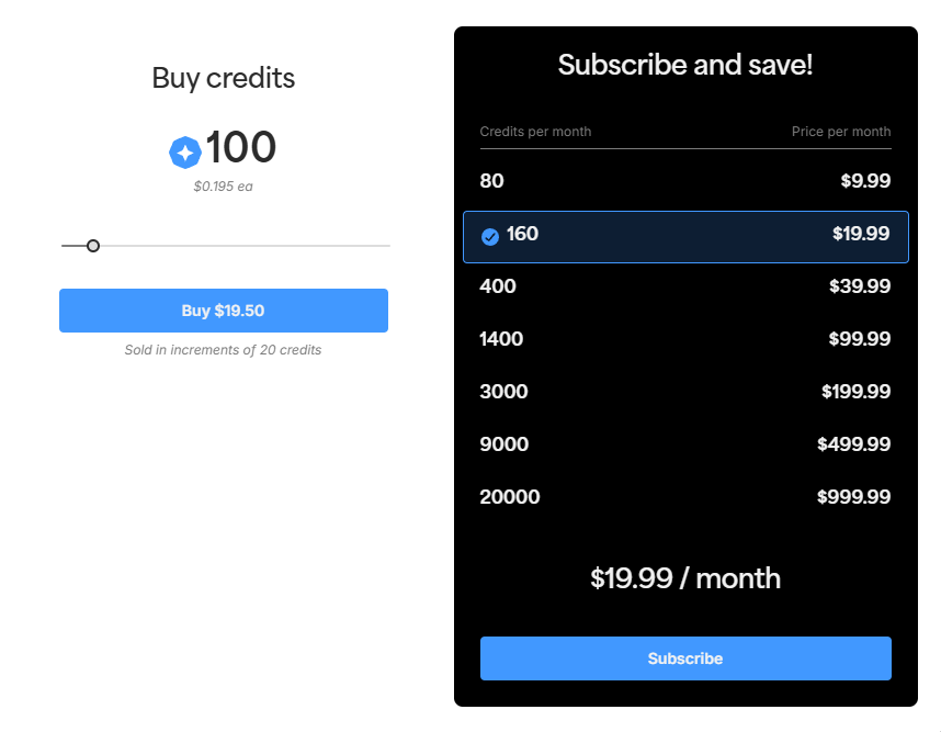 둘째는 정기적으로 일정량의 크레딧을 제공받는 구독 방식입니다. 이는 우측 화면에서 확인할 수 있듯이 다양한 구독 플랜을 제공하며, 월별로 일정 금액을 지불하고 크레딧을 확보하는 방식입니다. 현재 160 크레딧을 월 $19.99에 구독하는 플랜이 선택되어 있는데, 이를 통해 개당 크레딧 가격은 약 $0.125로, 일회성 구매 시보다 훨씬 저렴함을 알 수 있습니다. 구독 플랜은 대량 구매 시 개당 단가를 더욱 낮추는 구조를 가지고 있어, 예를 들어 20,000 크레딧을 월 $999.99에 구독하면 개당 약 $0.05까지 가격이 하락합니다. 따라서 Project Starlight를 꾸준히 사용하는 사용자라면 구독 방식이 비용 효율성 측면에서 압도적으로 유리합니다.