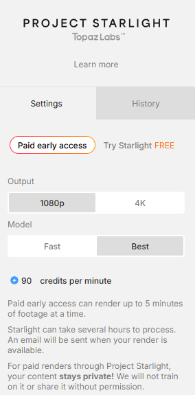 https://app.topazlabs.com/starlight 사이트에 접속해보시면, 아시겠지만 처음 가입하면 무료로 크레딧을 20줍니다. 그리고 10초의 짧은 영상을 시험해볼 수 있습니다. 저화질 영상이 있으시다면 성능 테스트를 위해 사이트로 접속해서 해보시길 바랍니다.